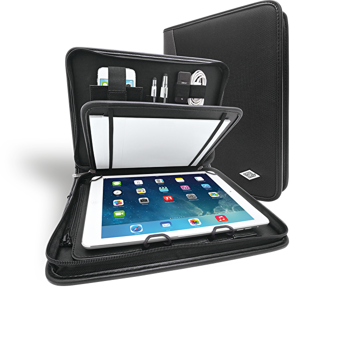 The flexible mounting mechanism fixes all the tablets with a length of 240-266 mm and a width of 170-186 mm safely and securely. The practical, multi-functional equipment with detachable 4-ring mechanism provides additional space for an A4 writing pad, accessories, pen and cards. Additional features: by means of a zipper detachable tablet holder (EU-Design RCD 001 341 390) with 2 openings for photo-lenses, folding presentation stand, 3 accessory holder e.g. charger cables etc., compartment to hold a A4 writing pad, detachable 4-ring-binder mechanism (Ø 32 mm, filling level 21 mm), exterior: compartment in front and a zippered pocket in the back.